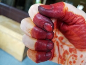 She carefully pulls each of my fingertips through a hole she bites into plastic, uses her finger to coat my fingertips with henna, then wraps and ties the plastic around each finger. Next she coats part of my palm with henna. Finally she gets out a toothpick to draw designs. Unfortunately the mixture is very wet and her designs keep blurring, making them blocky. She wraps my hand in plastic and tells me not to wash it until later that afternoon.