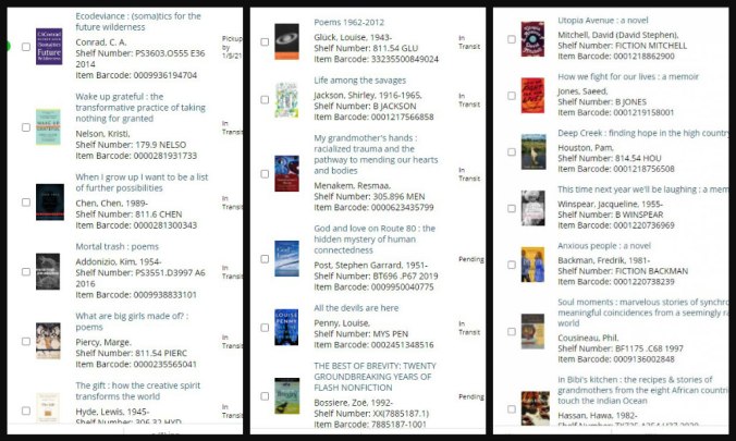 My budget doesn’t have much space for book purchases, but that’s okay, I’ve found a lifelong refuge in libraries. Many people have felt threatened by shortages of toilet paper and sanitizing wipes but I worry instead that the complete library lockdowns we experienced in the spring might recur. I’m one of those library patrons who regularly reserves a slew of books, from children’s picture books to those most recently reviewed in literary journals. Thanks to the extra hours insomnia gives me, I get through at least four books a week, often more. It’s impossible to imagine my life without books. Our rural county’s library system recently closed again due to increased pandemic risk but thankfully we can continue to get our books curbside. Every day a new pile of books comes in feels like a birthday to me.