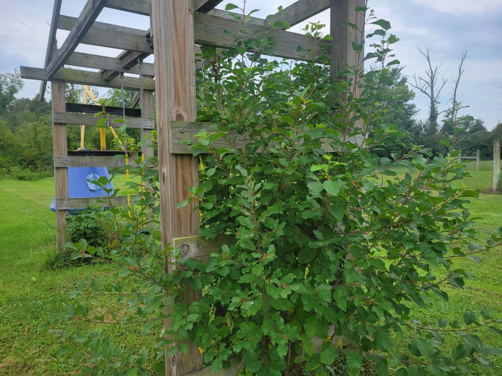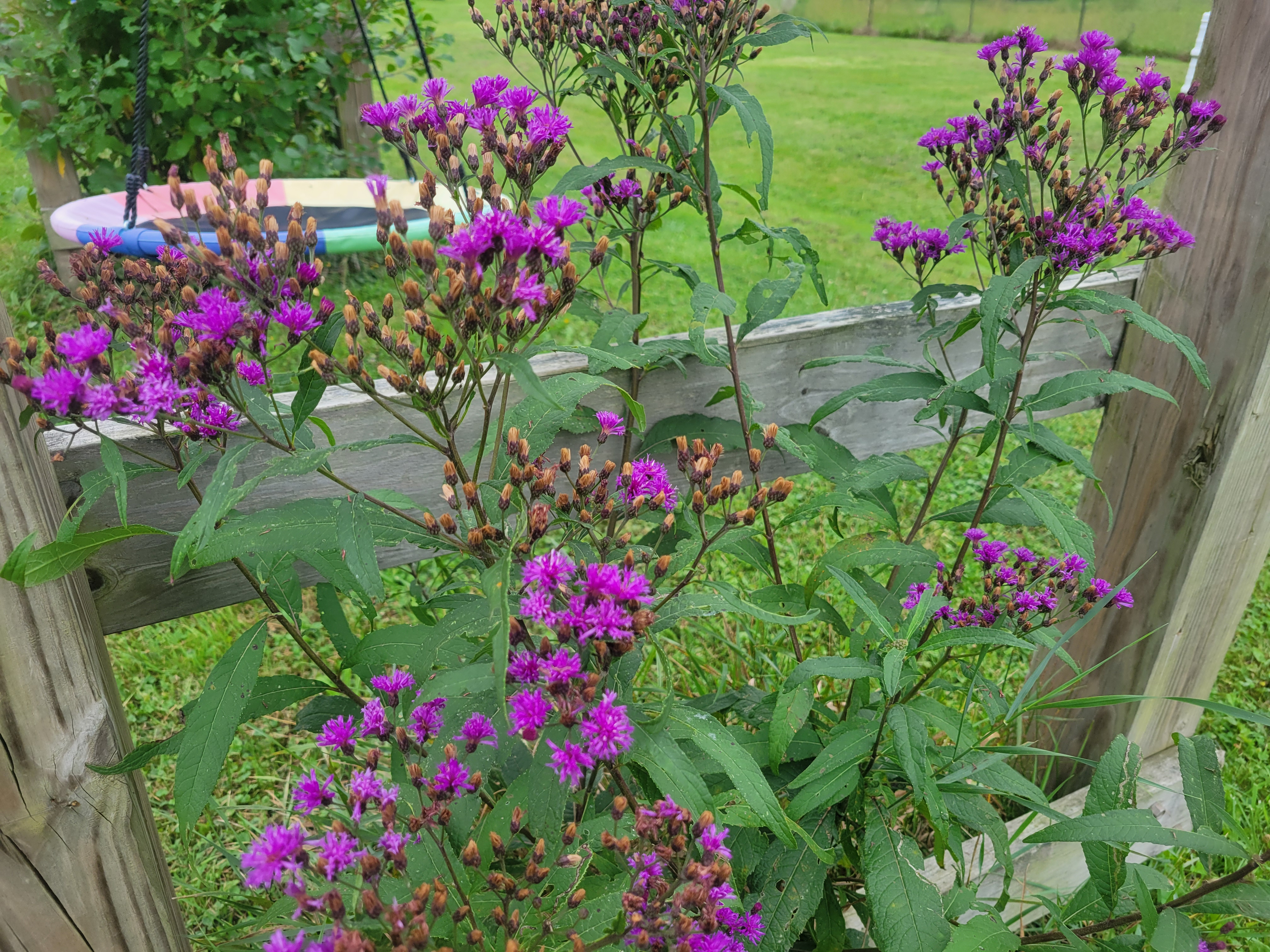 Ironweed sprouts up by the pond and here around our former kiwi arbor, now a swing set. Their bright flowers offer late-season nectar for bees, butterflies, hummingbirds, and other creatures.