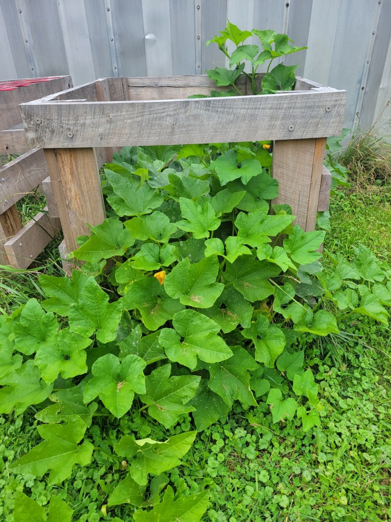 Healthy squash volunteers sprout in one of the compost bins.