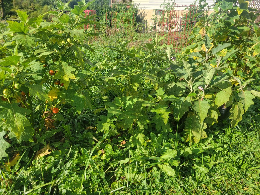 By September having given up on mowing rows, this garden patch is a weed-tastic morass still brimming with harvest-ready produce.
