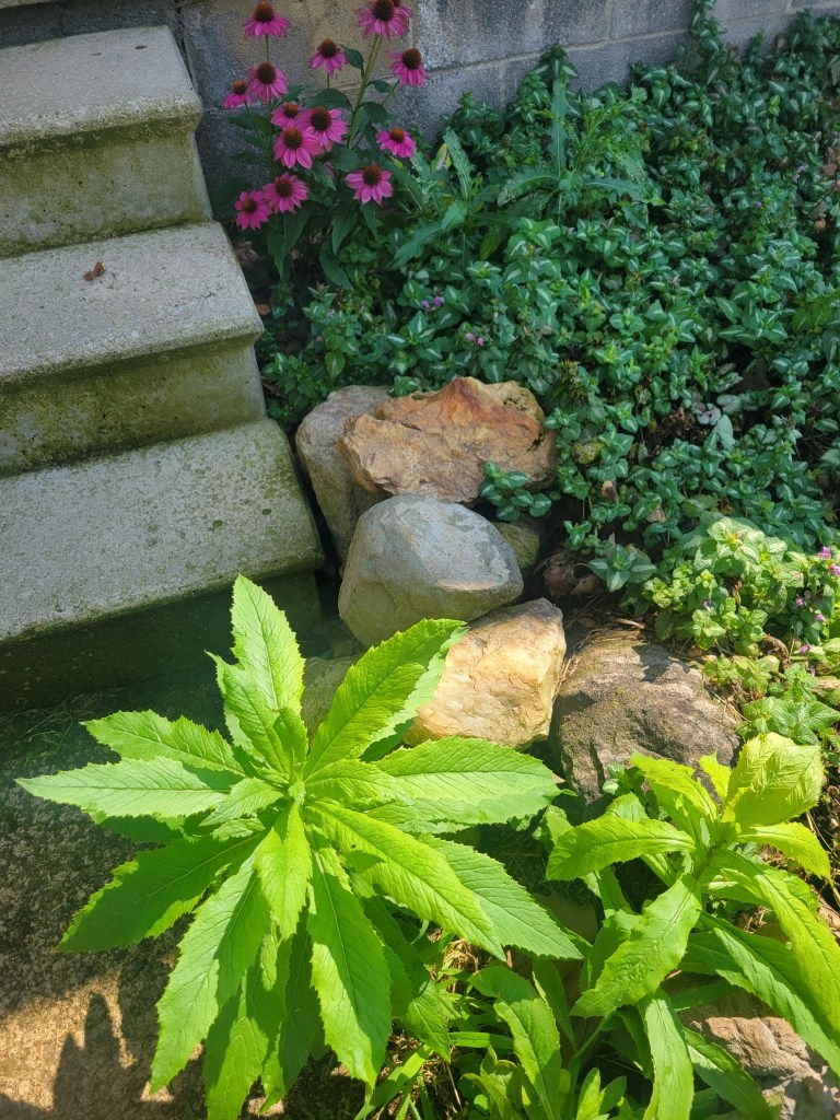 These plants by our front steps are so full of greenly health that I’ve let them stay. I think they are burnweed, aka as pilewort, which is apparently an aromatic herb also grown for medicinal use. I’m not confident enough in my plant ID to use it, but I do enjoy its cheerful nature.