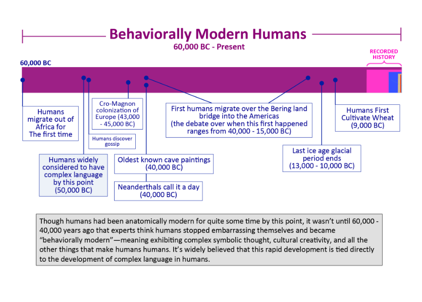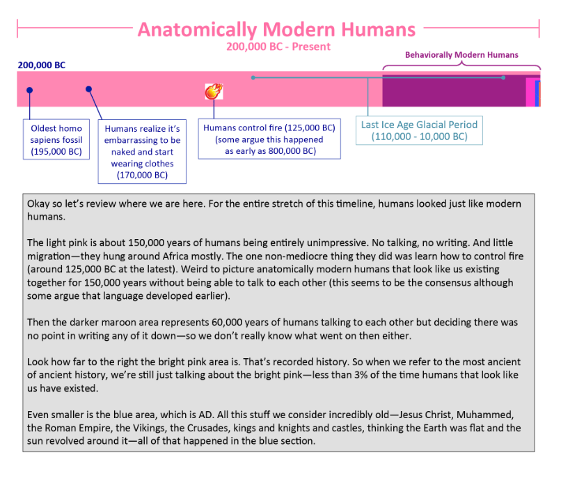Dinosaurs ruled the world for 165 million years. Homo sapiens showed up 200 to 300 thousand years ago. We humans are truly, in Earth time, a newly arrived species. As Tim Urban shows, over at Wait But Why, recorded history itself is a tiny blip of our time here.