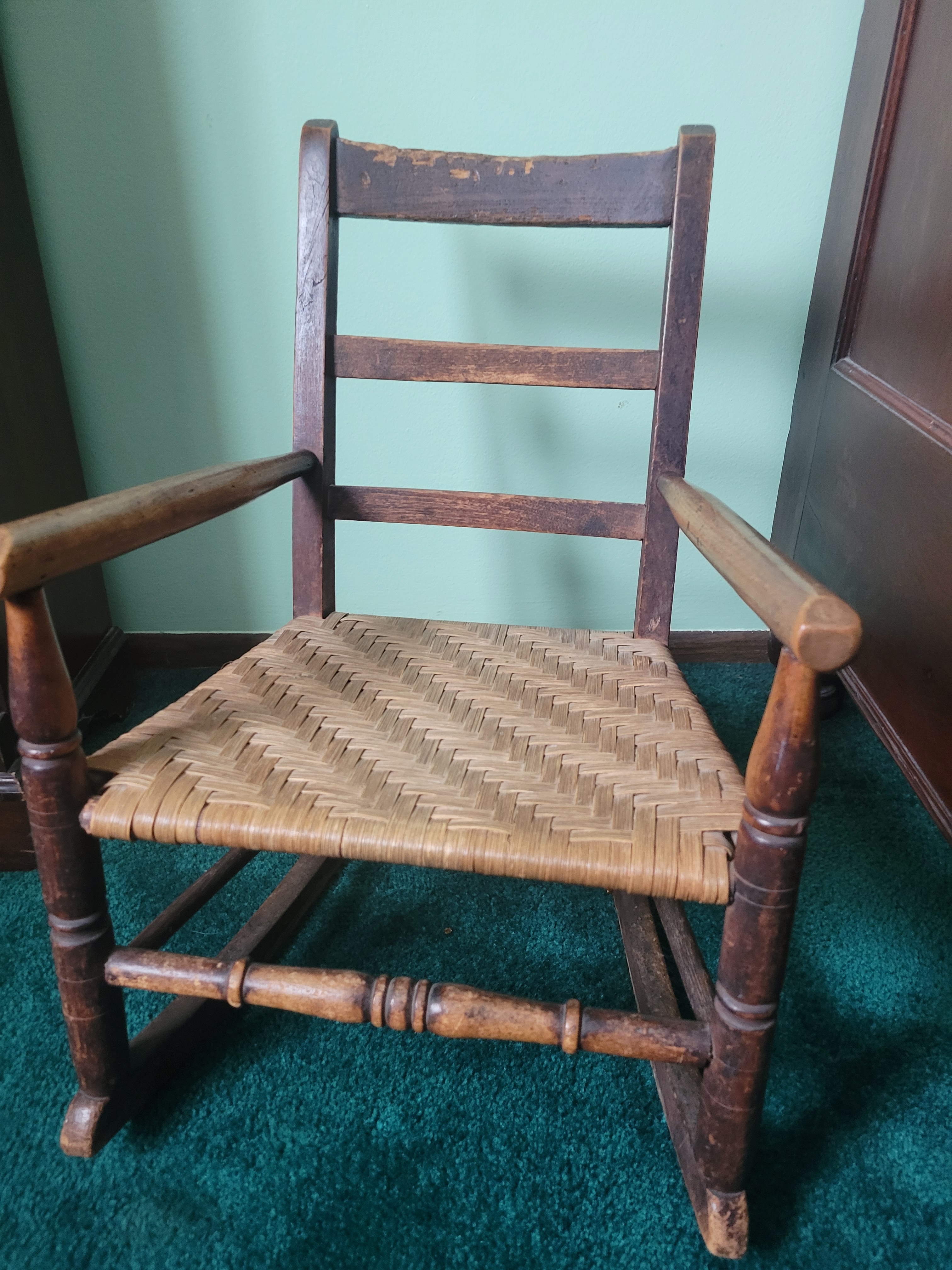 This is the tiny rocking chair my dad and his sibs rocked on, played with, and teethed on. It was used by countless cousins till it came to us.