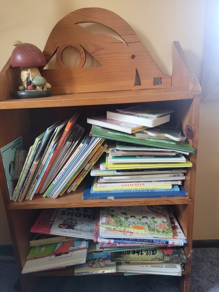 These shelves my sister designed and made have long been used to hold a gloriously messy assortment of kid books.