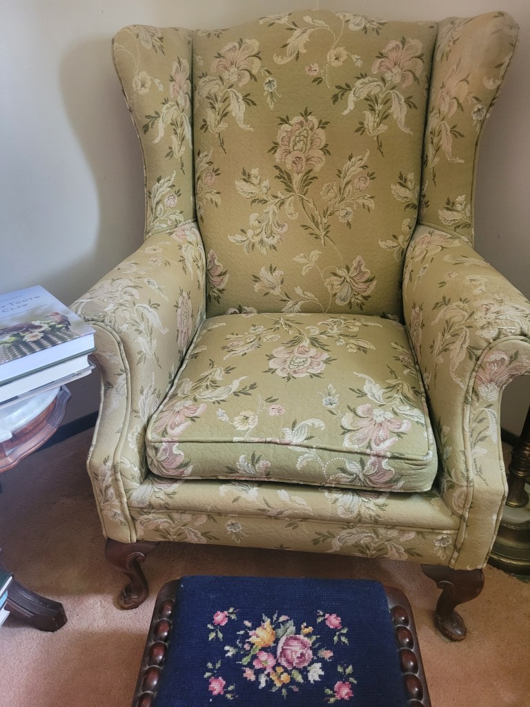 This admittedly worn but sturdy chair belonged to my Great-Aunt Mildred, which means it’s at least 70 or 80 years old. It probably needs to be recovered, but I don’t mind it as it is. Paired with a floor lamp from my parent’s home and footstool with crewel work by my grandmother and this corner of my bedroom is perfect for reading into the middle of the night when insomnia has me in its grip.