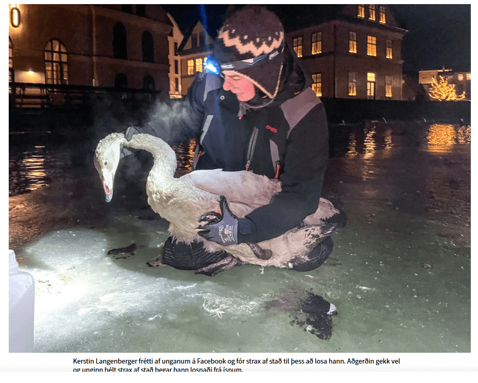 Yesterday a social media post reported that a swan chick was trapped in the ice-covered Tjörnin, a lake in Iceland’s capital city of Reykjavík. Conservationist Kerstin Langenberger saw the post and replied, “I am on my way with the necessary equipment.”