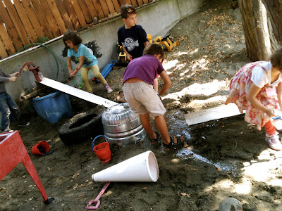 Two girl have made a bridge over a muddy area with a row of milk crates. They pound twigs with rocks until the wood crumbles into fibers, mix it with mud they scoop up with spoons, then arrange it on tree branch slices. A group of four-year-olds drag a few planks over some bicycle tires, running and jumping on the tippy boards in a game that seems to be about danger and rescue. Many kids are playing in little enclosures they’ve made from tarps hung over low tree branches or within a circle of logs. These child-made places are nearly empty some days, other days they’re brimming with activity. The most popular spot seems to be a large pile of dirt in a far corner, left there when a utility line had to be dug up and repaired. Some kids pour rivulets of water from the top of the pile, watching it snake down the uneven surface. Others put sticks in the dirt, arrange rocks on it, roll balls down it, and make ramps leading up to it. One little boy ran up and down the pile, but stopped when he saw he’d nearly stepped on another boy’s plastic figure. He crouched down next to him and they both buried, discovered, and reburied the toy a few times before flattening a path in the dirt with a measuring cup and letting the figure drive a measuring cup car on this de-facto road.