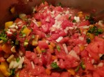 Putting up food from our gardens. This year we canned somewhat less than usual, but still put up well over 100 jars of salsa, sauces, jam, and syrups. This melange was photographed in our five gallon pot.