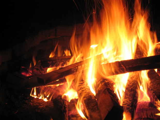 This was highly irregular. Fire? Hiking after dark? Staying up past bedtime? Our speculative whispers were unsuccessfully hushed by the grown-ups. We arrived at the clearing where morning worship services were held. It looked different at night. Shadowy trees loomed over the ring of log seats. Adults leaned their torches toward a dark stack of wood until a bonfire flared.