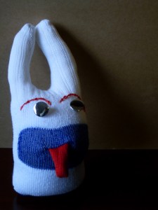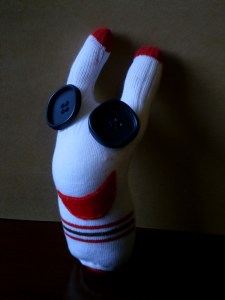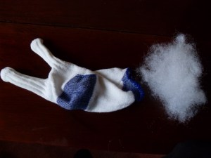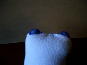 Stuff the sock tightly with polyfill or old pillow contents or dryer lint or whatever you’ve got. Start with the ears and work your way down.  Leave the bottom end open for now, as you may want to stitch through this opening as you add features.