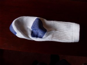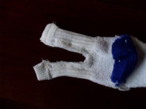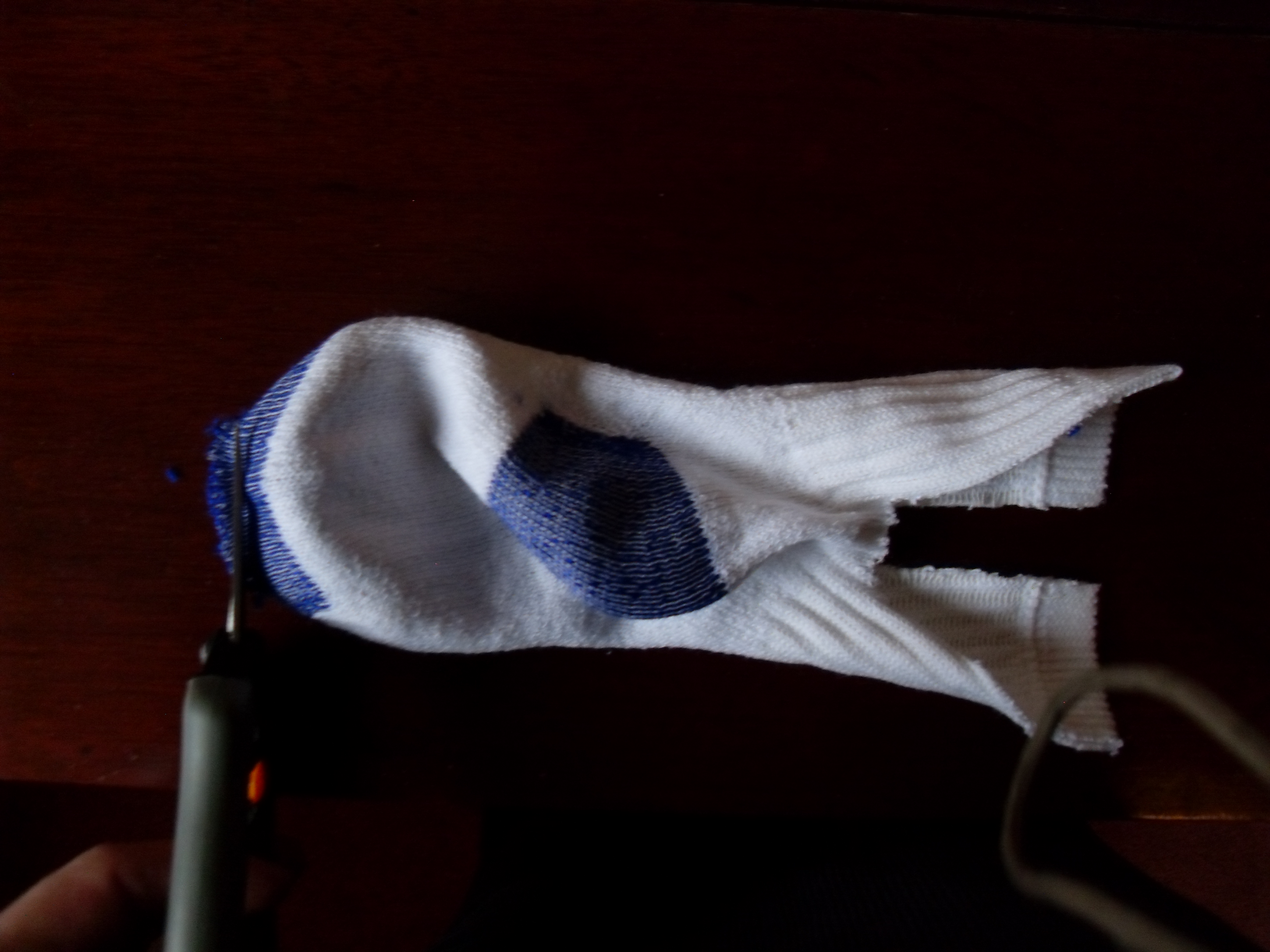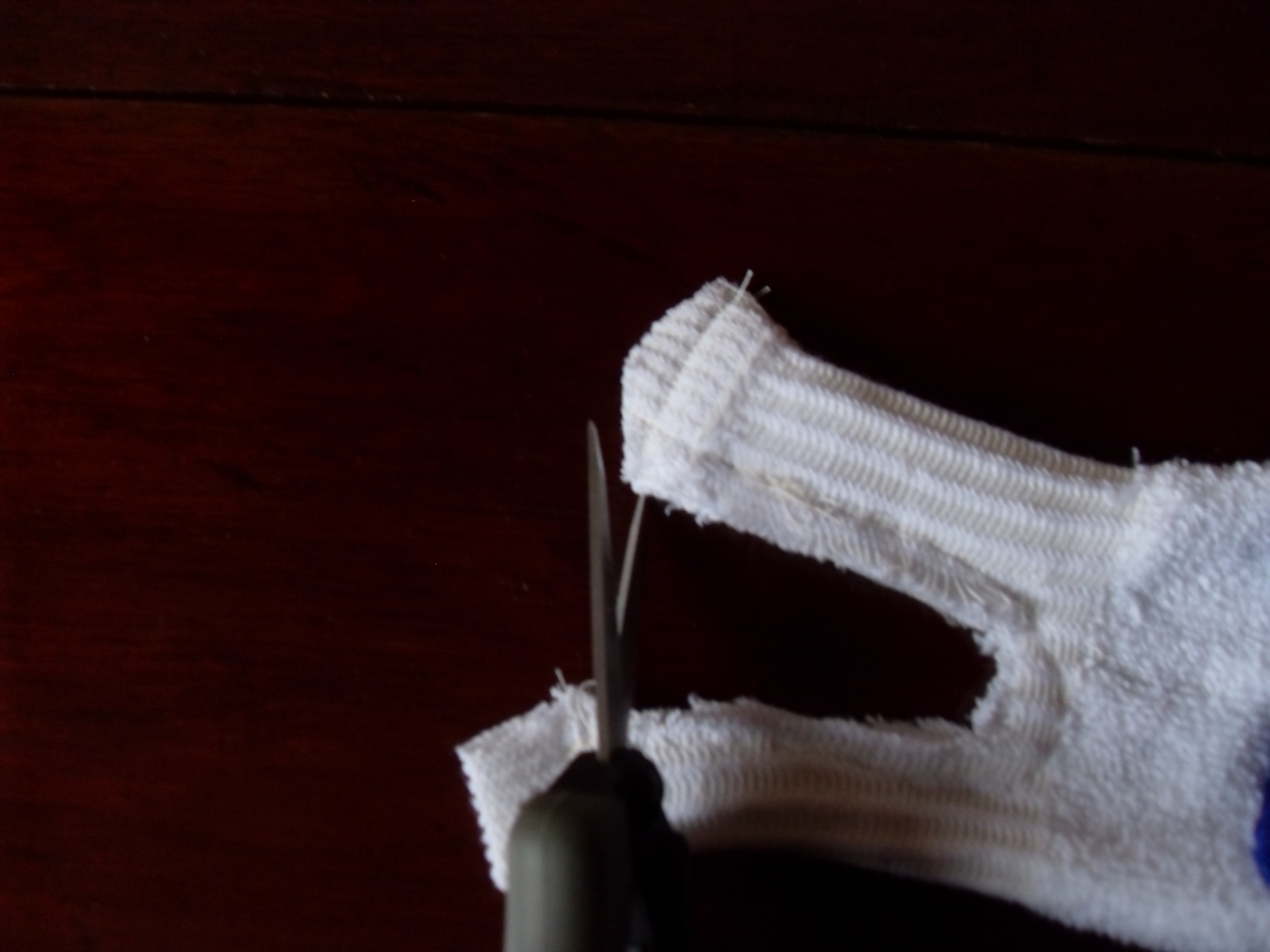 Remove an inch or so strip from the open end of the sock. Snip open a small space at the toe.  If you choose, make a small slit at the heel where you can sew in a tongue or tasty morsel the monster might want to chew on.