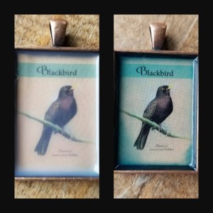 Then I decided to make book pendants that could be worn or used to mark one’s place. It seemed simple. Reproduce the cover image in tiny rectangles to fit pendant tray blanks. Adhere them to the trays. Cover with a layer of clear epoxy or glaze, let dry, and thread with a sheer ribbon. I got the images made at Staples. I read comparisons of adhesives and glazes, finding out more about Judikins Diamond Glaze and Mod Podge Dimensional Magic than I ever imagined. And with my husband’s help, got started.